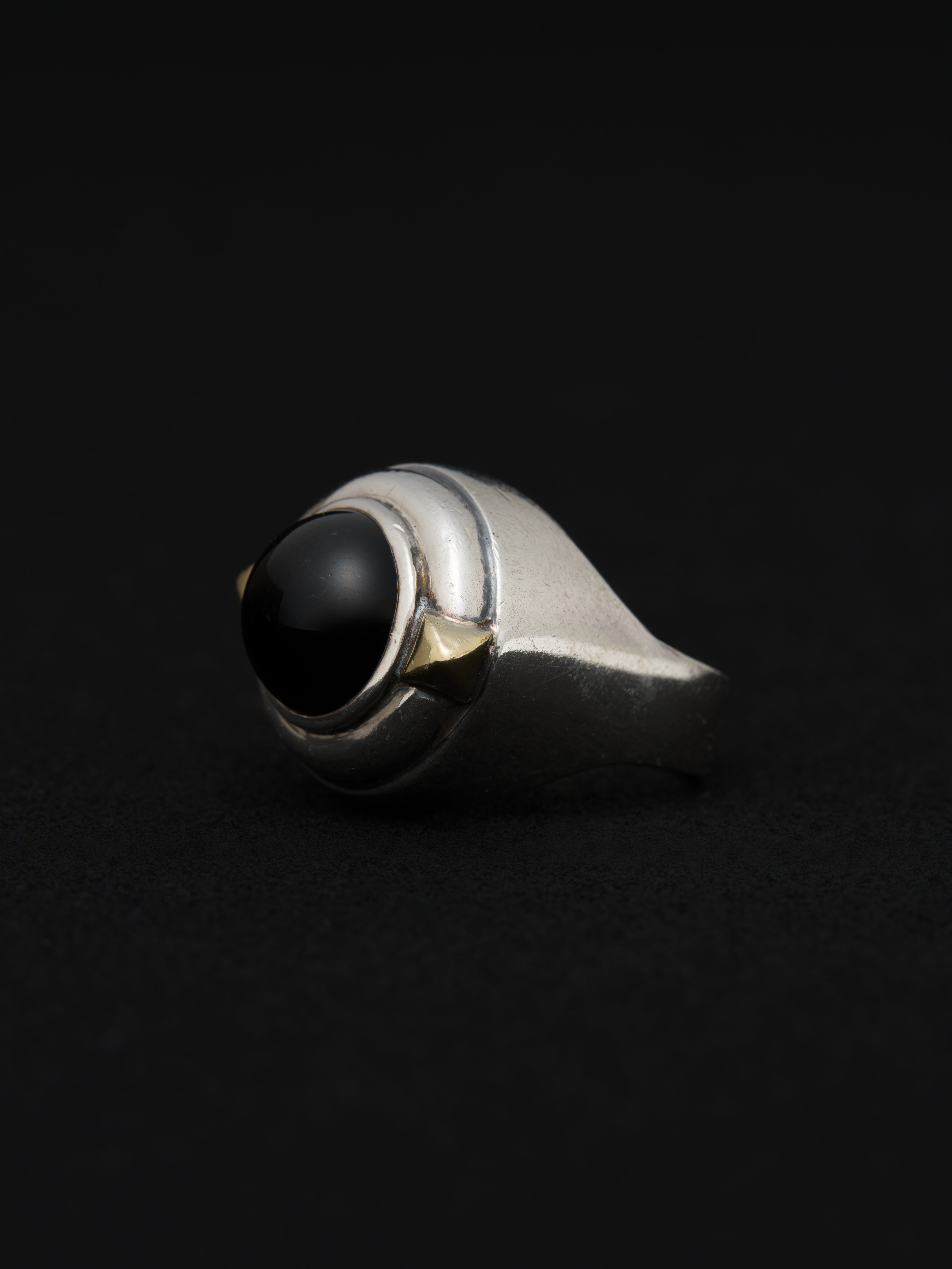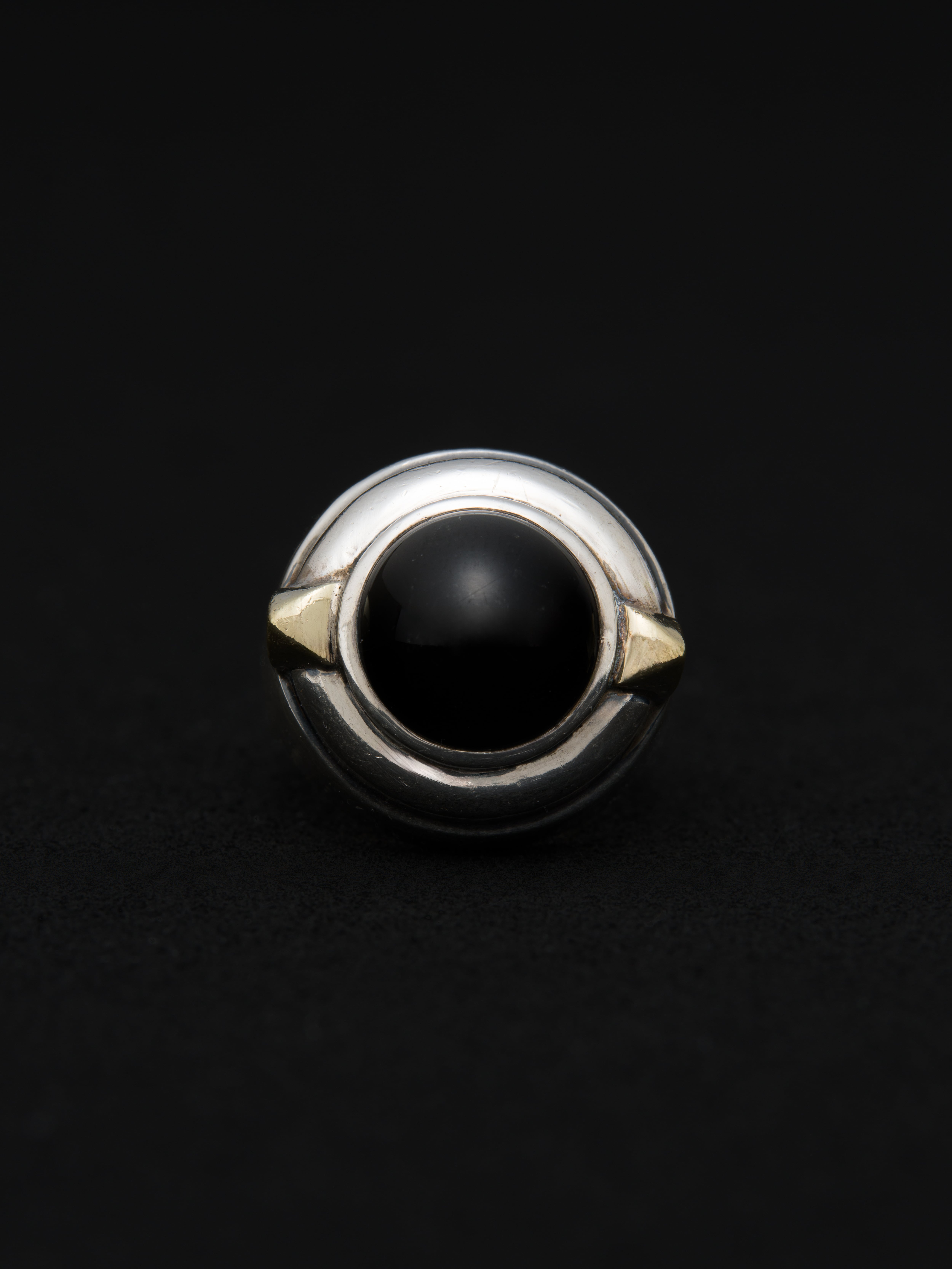 Lagos|ラゴス シルバーと18Kゴールド製のリング、中央にオニキス。 1977年にSteven Lagosによってアメリカで創業。その後、1984年にブランドの代名詞であるCaviarコレクションを確立しました。イノベーションをブランドのテーマに掲げ、新しいテクノロジーや素材を積極的にジュエリーに取り入れています。 アメリカ製 シルバー925|18Kゴールド|オニキス サイズ|JP 14 アイテムナンバー|R1898