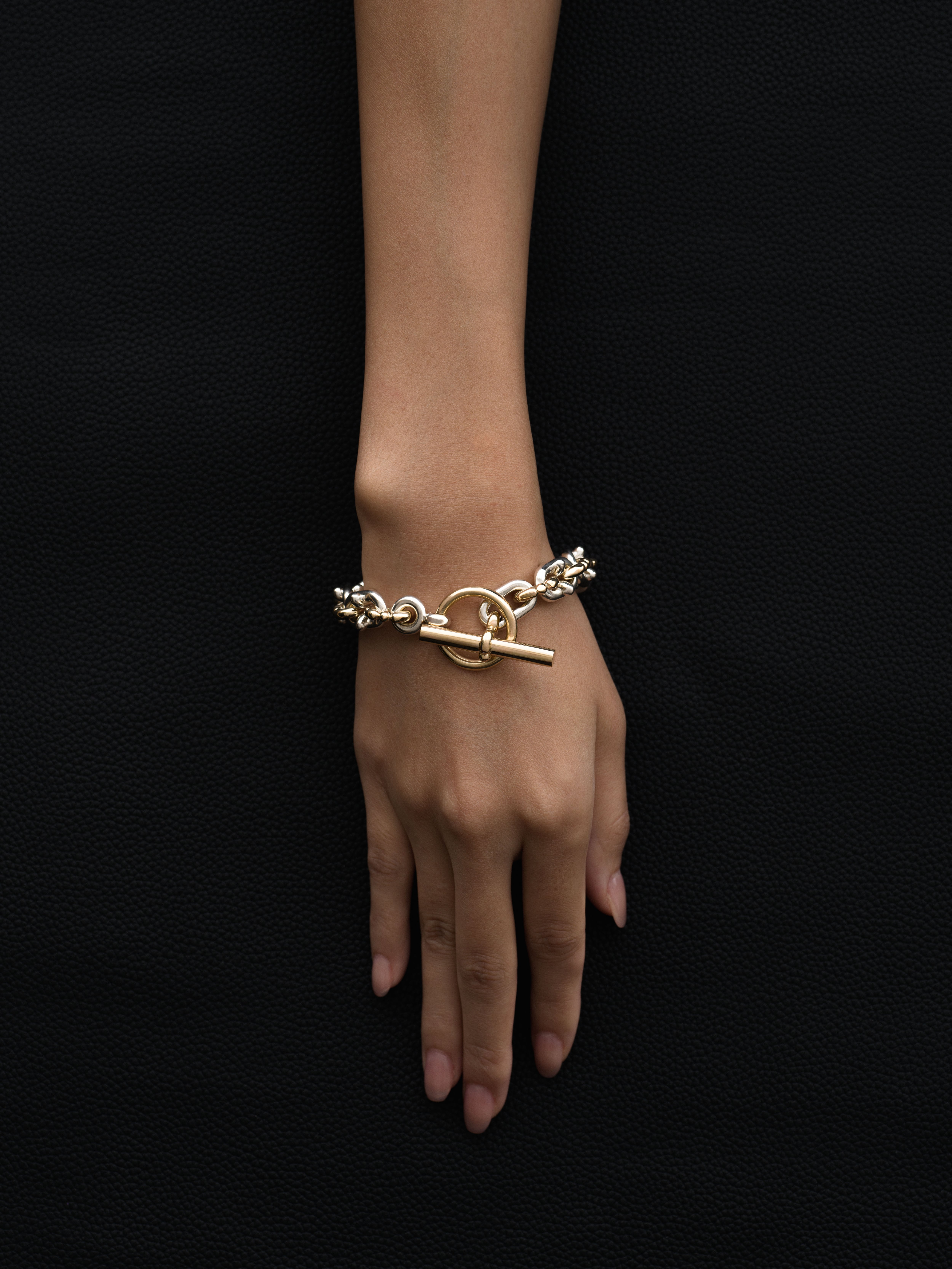 RHODES|ローズ シルバーと18Kゴールド製のブレスレット。 ローズは2021年にファビュラスサウンズのディレクター、吉田量によって設立したブランド。インスピレーションをキーワードに、多彩なデザインのジュエリーを展開。 日本製 シルバー925|18Kゴールド S|内周 : 15cm|幅 : 1.1cm M|内周 : 17cm|幅 : 1.1cm L|内周 : 19cm|幅 : 1.1cm アイテムナンバー|MC027