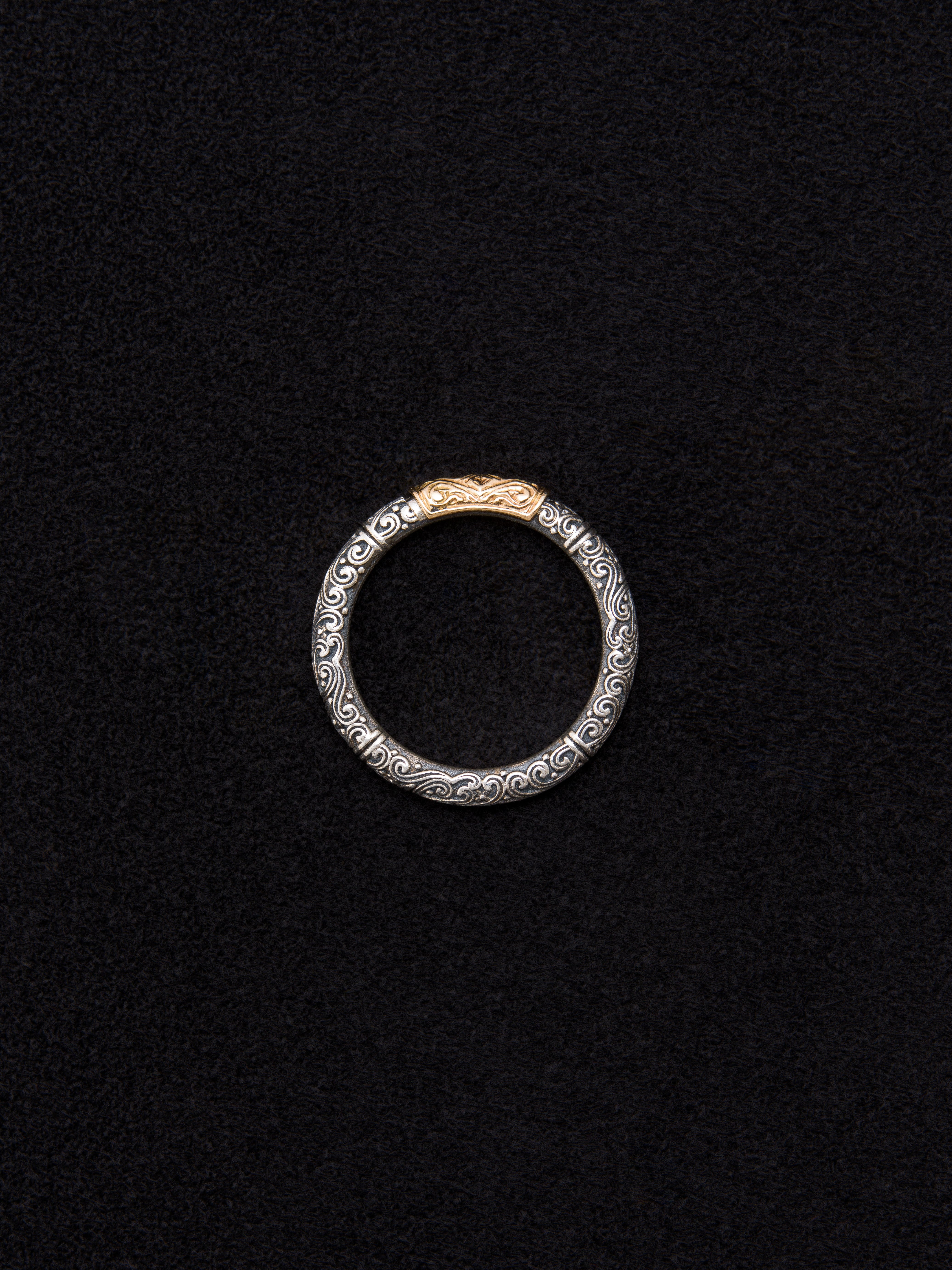 Gerochristo|ジェロクリスト シルバーと18Kゴールド製のバンドリング。 ギリシアに拠点を置くジェロクリストは、古典芸術様式であるビザンチンに影響を受けた伝統的な装飾技術を用い、クラシックとモダンが調和する独自のデザインでジュエリーを創り上げています。 ギリシア製 シルバー925|18Kゴールド サイズ|JP 16.5 アイテムナンバー|GR101