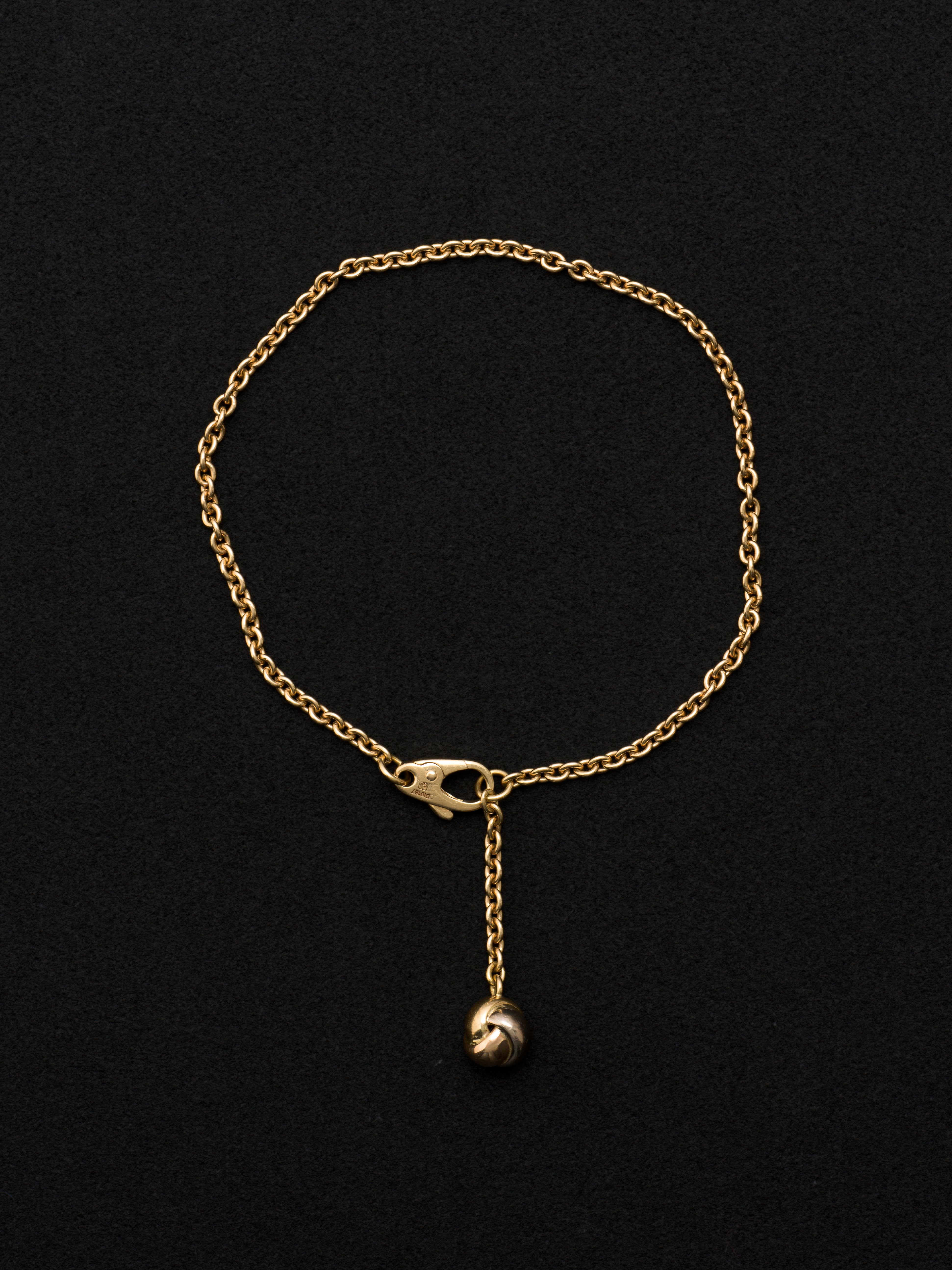 Cartier〈カルティエ〉の18Kゴールド製ブレスレット、トリニティモチーフのチャーム付き。 フランス製 18Kイエローゴールド|18Kホワイトゴールド|18Kローズゴールド 内周 : 17cm|幅 : 2mm アイテムナンバー|B1290